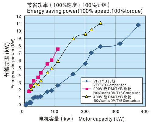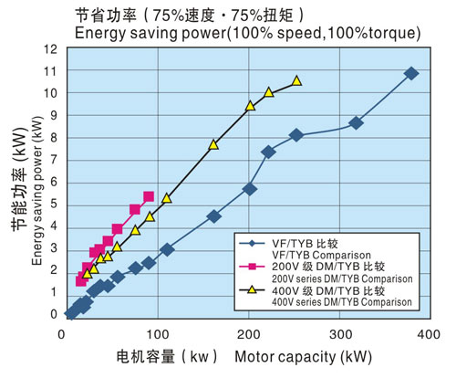 下圖是通過(guò)(TYB電機(jī)++INV)組合下的綜合效率與(感應(yīng)電機(jī)(IM)+INV)、(直流電機(jī)(DM)+直流驅(qū)動(dòng)裝置)的綜合效率之差來(lái)表示節(jié)省功率的。