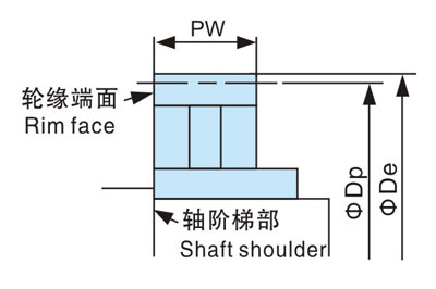 為了減小電機(jī)輸出軸上的載荷,安裝時(shí)請(qǐng)按照下圖安裝,使V滑輪的輪緣端面與軸階梯部在同一平面。
