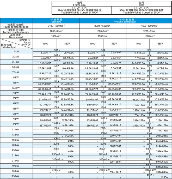 注1) 315kW 375kW 450kW以及750kW中,*標(biāo)記只表示恒轉(zhuǎn)矩控制。但是,如果容A從750kW降低到700kW,則可適用于電機(jī)轉(zhuǎn)速范圍1500~1200min-1。  (700kW 1500/1200 min-1 1101/1170A)